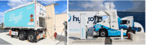 Légende : à gauche, conteneur de Lhyfe avitaillant la station hydrogène de Hyliko, à Villabé. A droite, camion hydrogène Hyliko en cours d’avitaillement sur la station de Villabé. Crédit : Hyliko et Lhyfe. Plus de visuels HD sur ce lien.